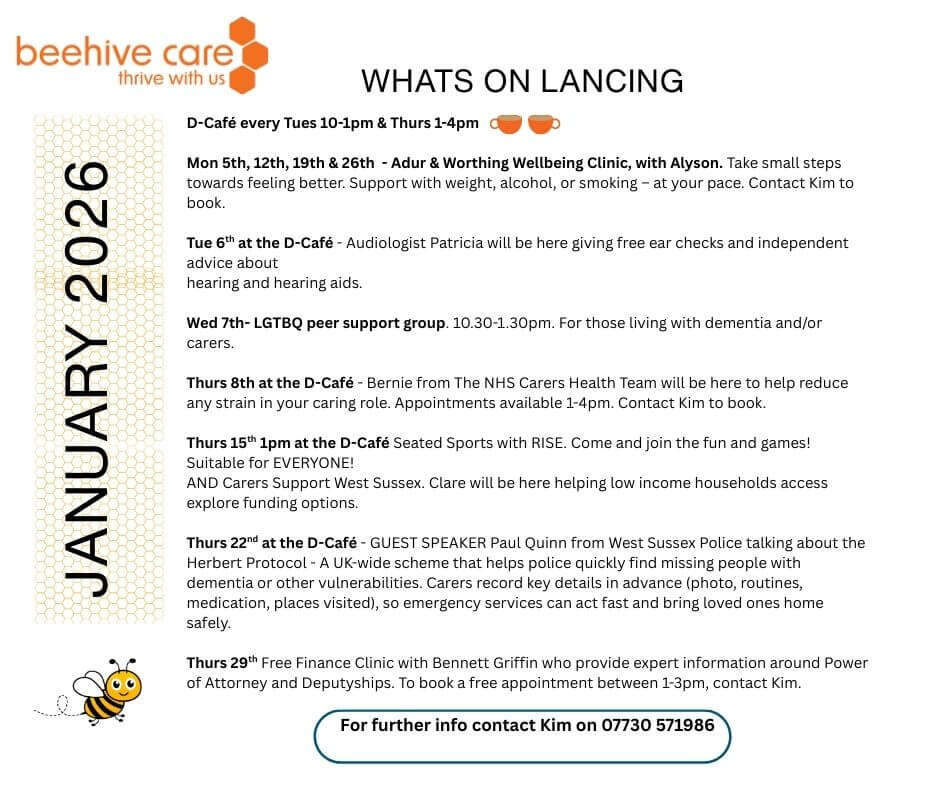 Thurs 22 Jan at the D-Café – Guest speaker, Paul Quinn, from West Sussex Police will be talking about the Herbert Protocol. A UK-wide scheme that helps police quickly find missing people with dementia or other vulnerabilities. Carers record key details in advance (photo, routines, medication, places visited), so emergency services can act fast and return loved ones home safely.