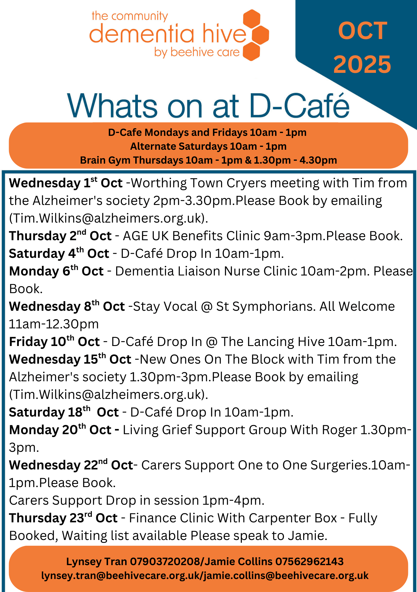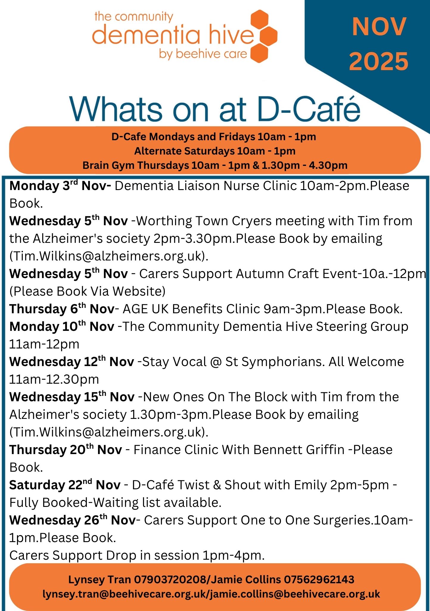 New Ones On The Block is with Tim from the Alzheimer’s Society on 15 November from 1.30 pm – 3pm. Carers Support one-to-one surgeries on 26 November (10am-1pm – please book) and a drop-in session between 1pm and 4pm. Our Finance Clinic with Bennett Griffin 20 November, please book or ask Jamie for more details.