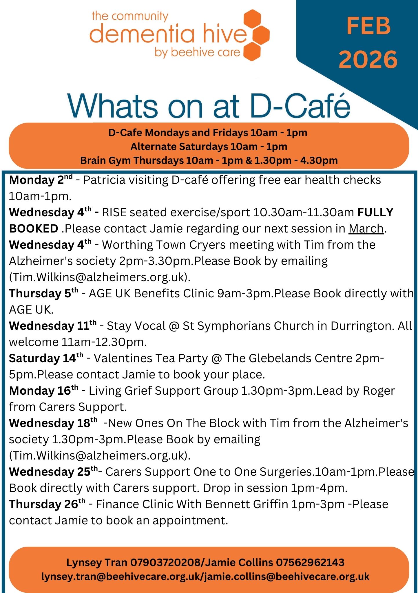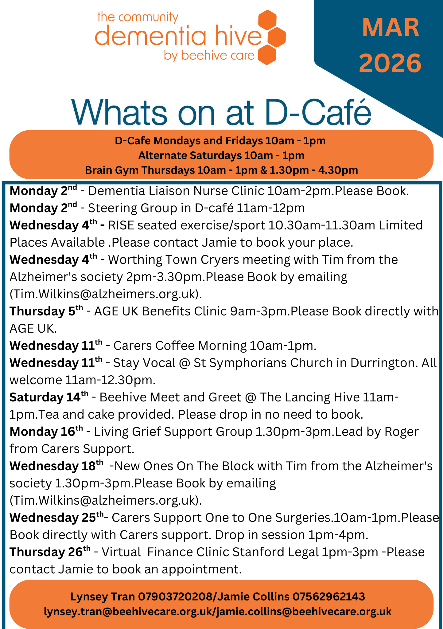Located at 50 Ferring Street, Ferring, BN12 5JP, the Community Dementia Hive is your go-to destination for valuable advice, local services, and a wealth of social events and activities. Download our What’s On for this month.