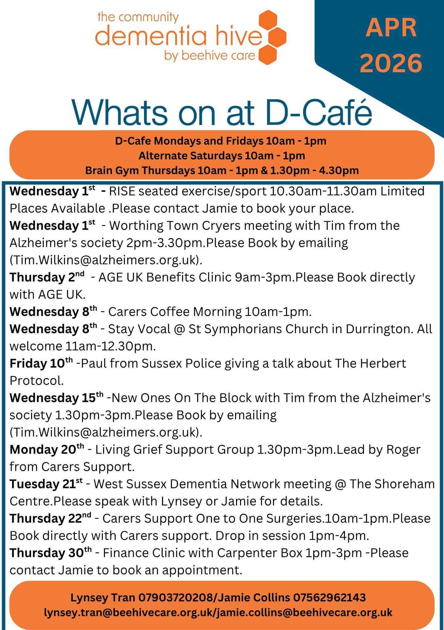Tuesday, 21 April: West Sussex Dementia Network Meeting at The Shoreham Centre. Please speak with Lynsey or Jamie for details.